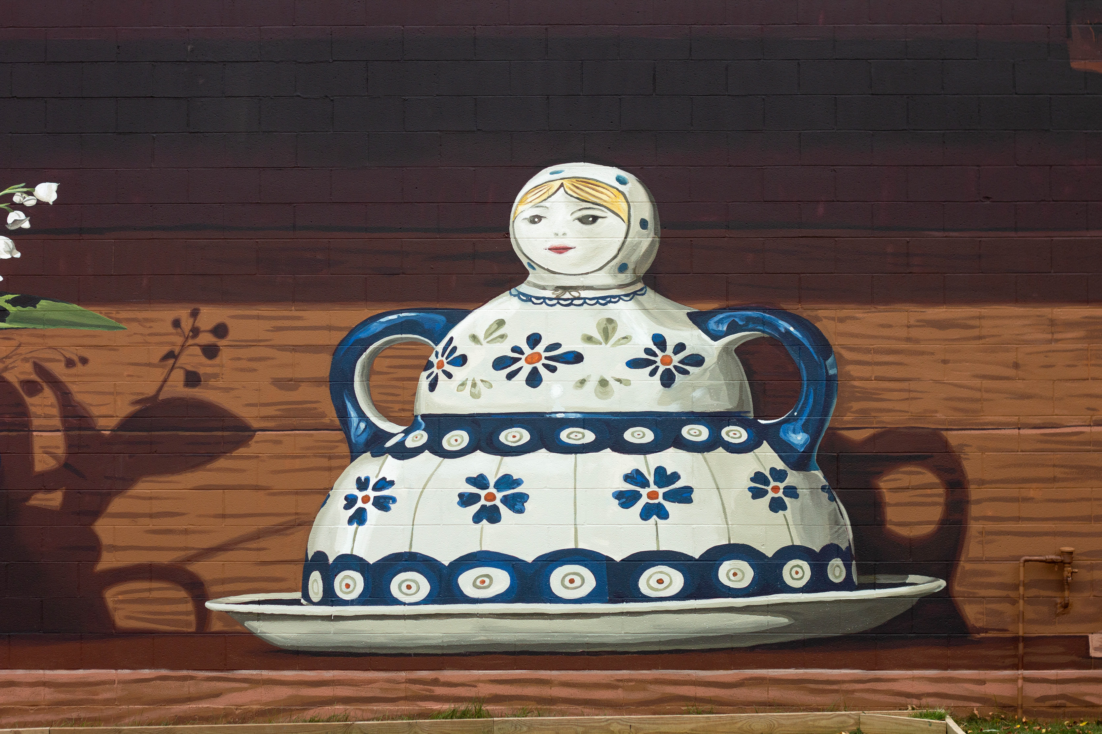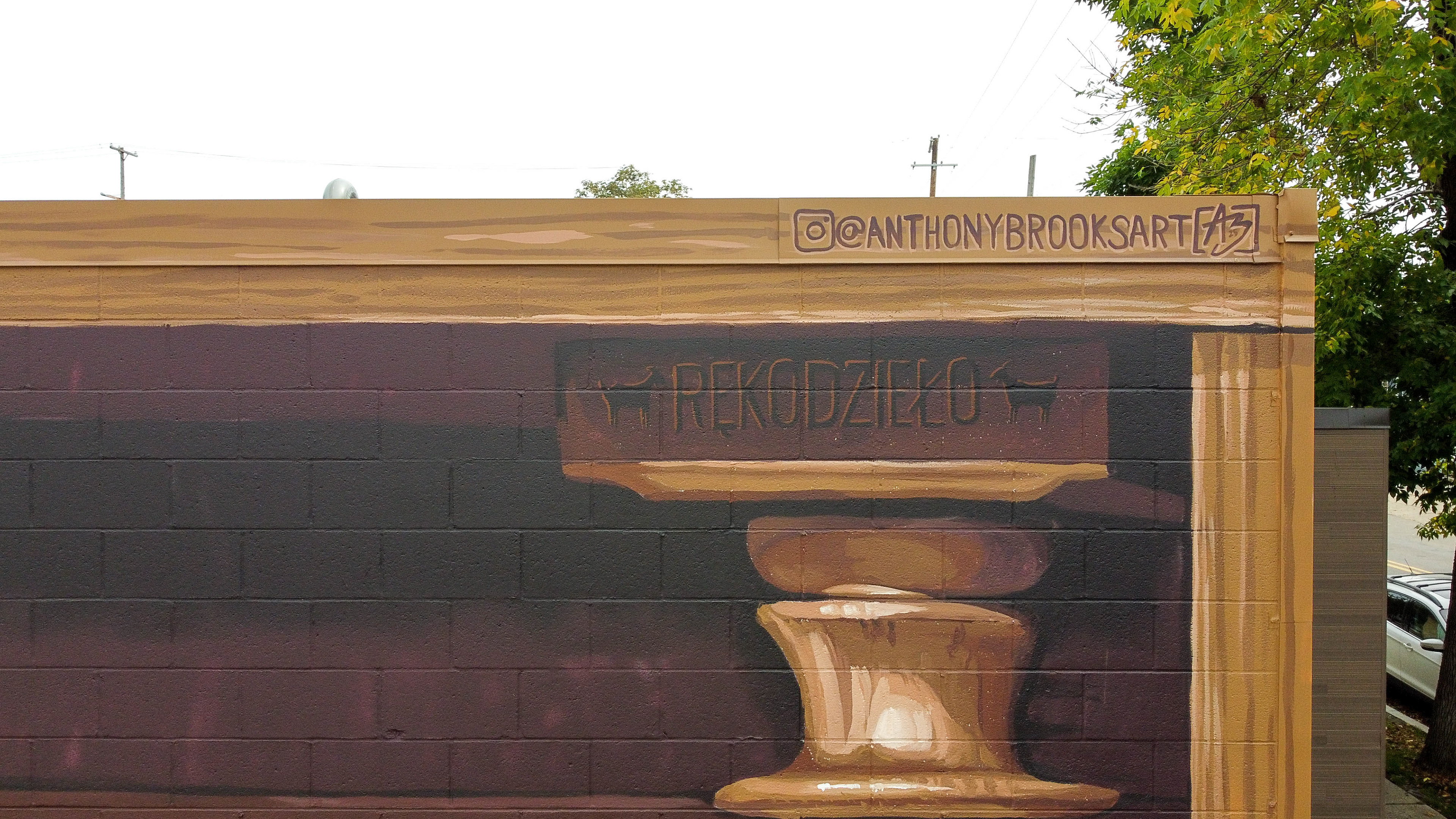 The title of the piece, "Rekodzieło", means handmade and is in reference to the handcrafted nature of everything in the piece as well as my own artistry and craftsmanship that went into creating the mural itself. I have a deep respect for my own Eastern European culture and feel that in many ways, it's the basis for my artistic interest and the reason that I was able to paint this mural in the first place, and was beyond honored to be able to pay my respects in such a format.