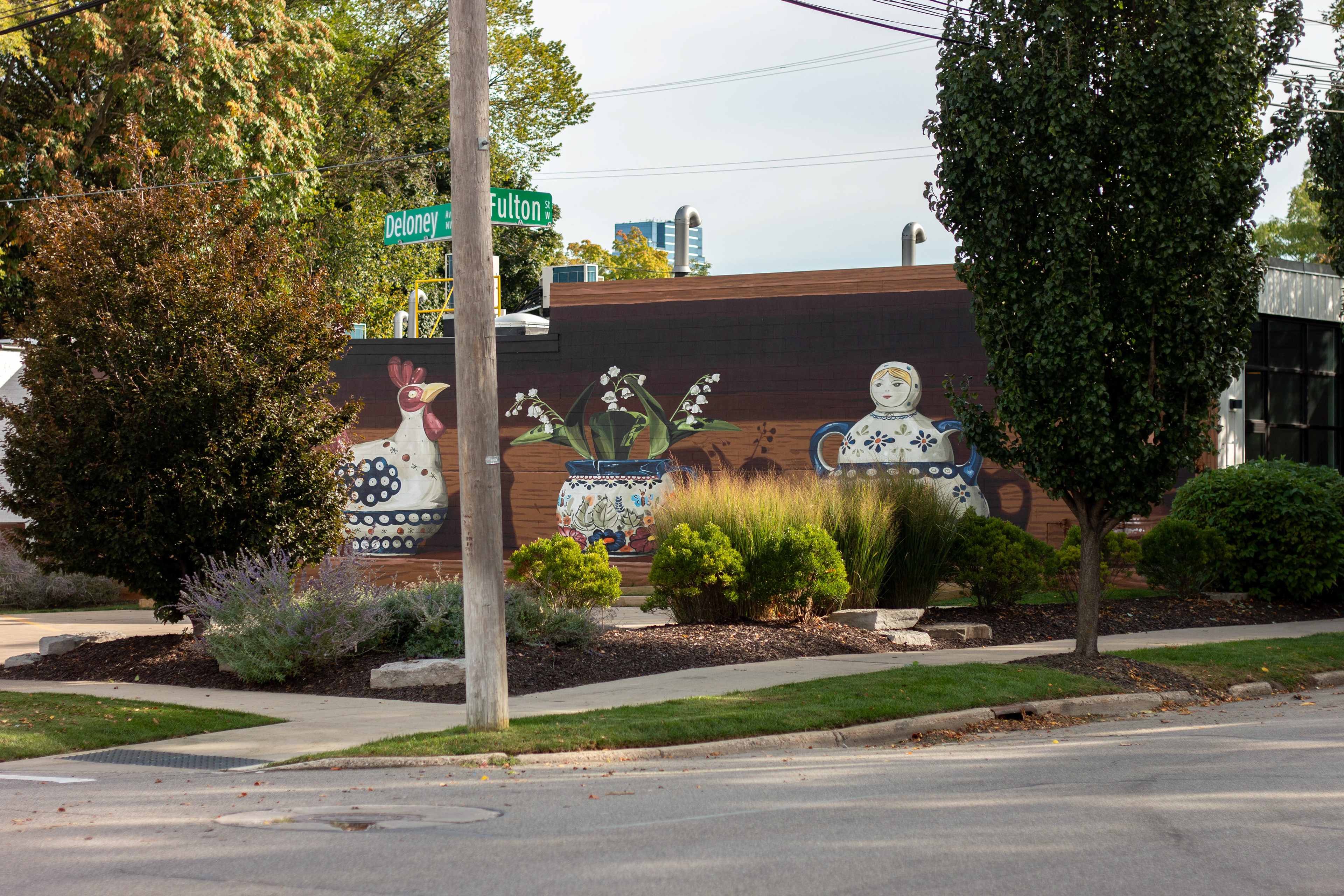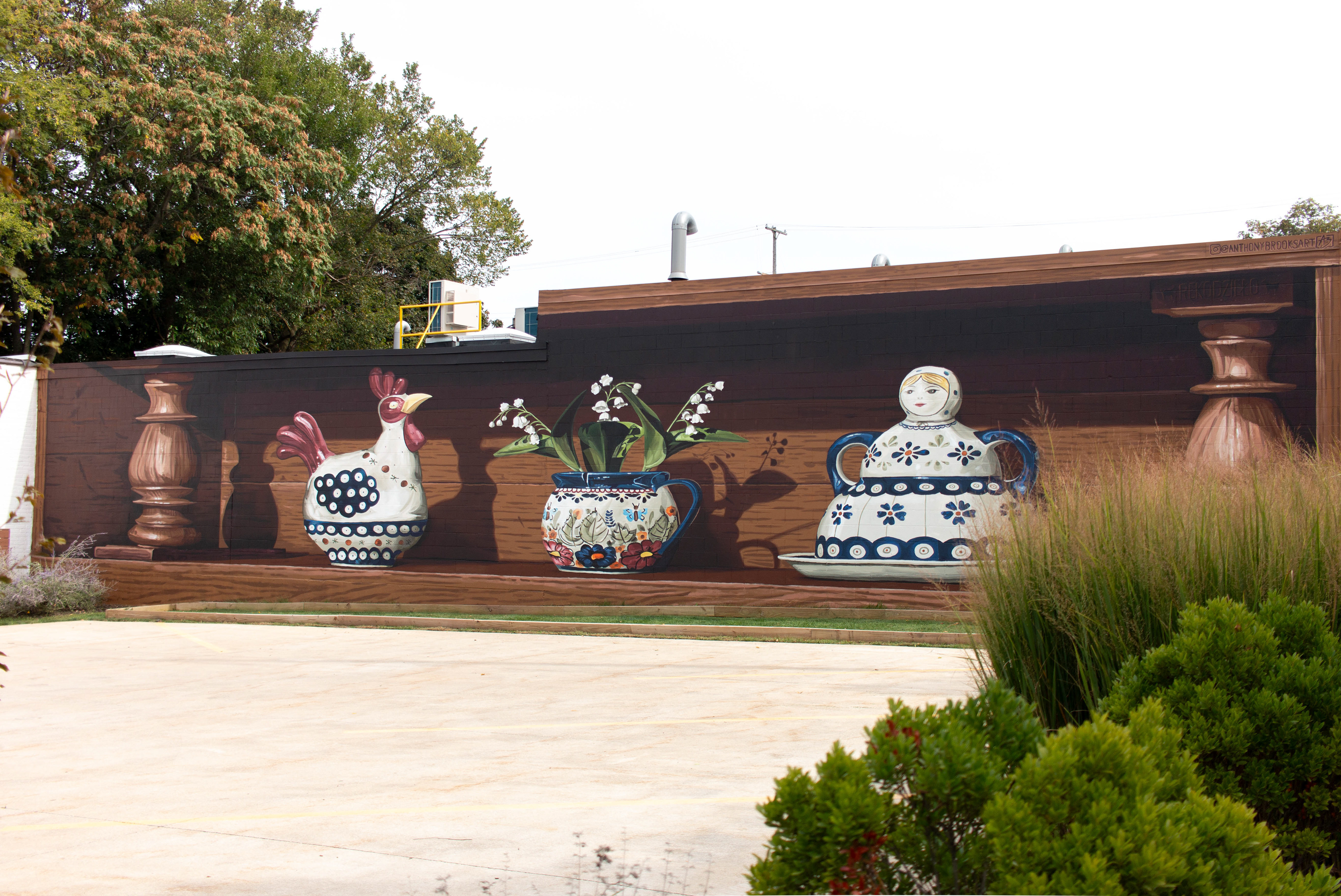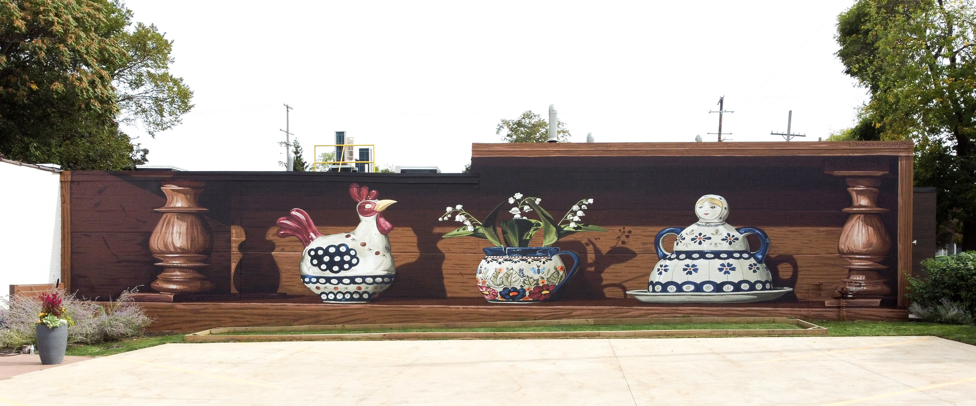 So after getting back home, I was connected with Brent from Construction Simplified, the owner of the building, and provided with some resources on the Eastern European population in the area and how he really wanted a piece that highlighted them and their contributions to the area. Which, for me, was instantly something special, as I come from an Eastern European family and upon further research, the area in Poland where many of the people in the West Fulton area originated is only a couple of hours from where I live in Berlin, Germany. I proposed the idea to Brent and the others spearheading the project of an old hutch with ceramics on it. The type that you see in your grandmother (or mother's) kitchen and that for me, feel like home and nostalgia. They went for the concept wholeheartedly, despite vocalizing how it wasn't at all what they initially had in mind. So I spent a week mapping out the locations in Poznan, Poland (the previously mentioned area in Poland) where I could find the "Bolesławiec" pottery as well as what present day ceramicists are making. I wanted to learn more about the patterns, what they grew up with, and what meant what and intended to make a day trip to Poznan to learn more.