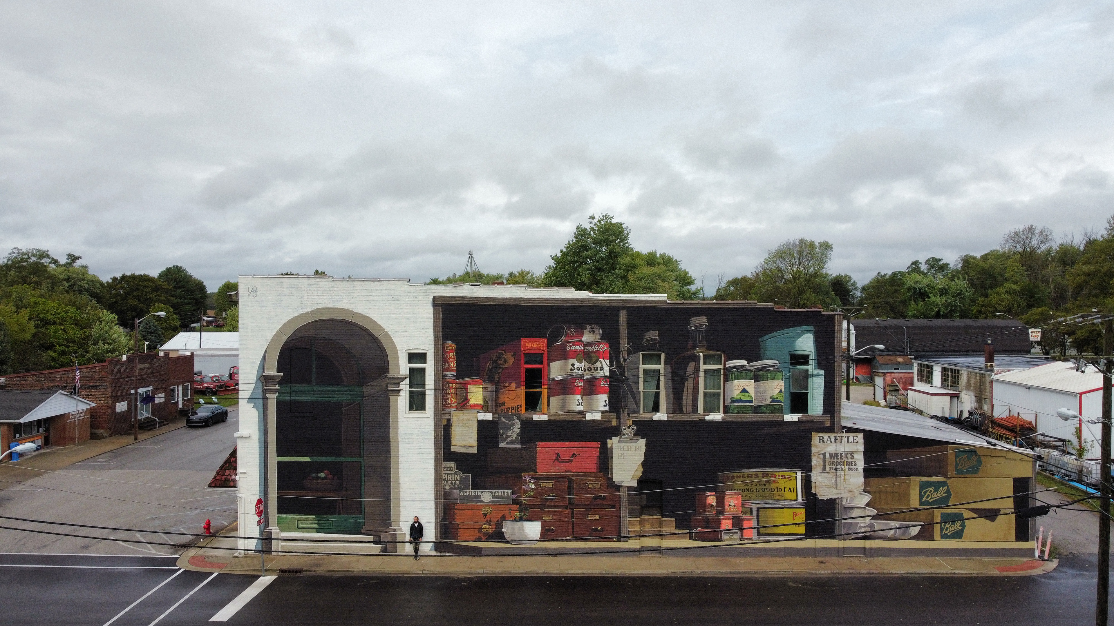 In addition to what is painted, I spent a lot of time prepping the "how". How it will be viewed, how I want it to be viewed, and how I can integrate my concept and vision with the existing architecture. I modeled the building in 3D software, visited the painting site multiple times in the leadup to the project to take photos/video with my drone, and planned where the best viewing spot for the piece would be, as the painting is dependent on being viewed from a very specific spot/angle. In the end, I decided to focus on the cars and inhabitants of Main Street, rather than those driving down the highway. I know that a lot of these mural projects are trying to "bring people into the town", but I really wanted this to be for those who are already there. People will always come to visit and see an interesting artwork, so that's secondary (or even tertiary), but the most important thing is that this connects with those who know the building and have their own memories and connection to the space. To push it a bit further, I designed the distortion of the piece so that when you're coming down Main St. toward the wall and stop at the stop sign, the distortion disappears and the painting aligns to feel real. As if it's a part of the space and some monumental view, transforming the space into something more.