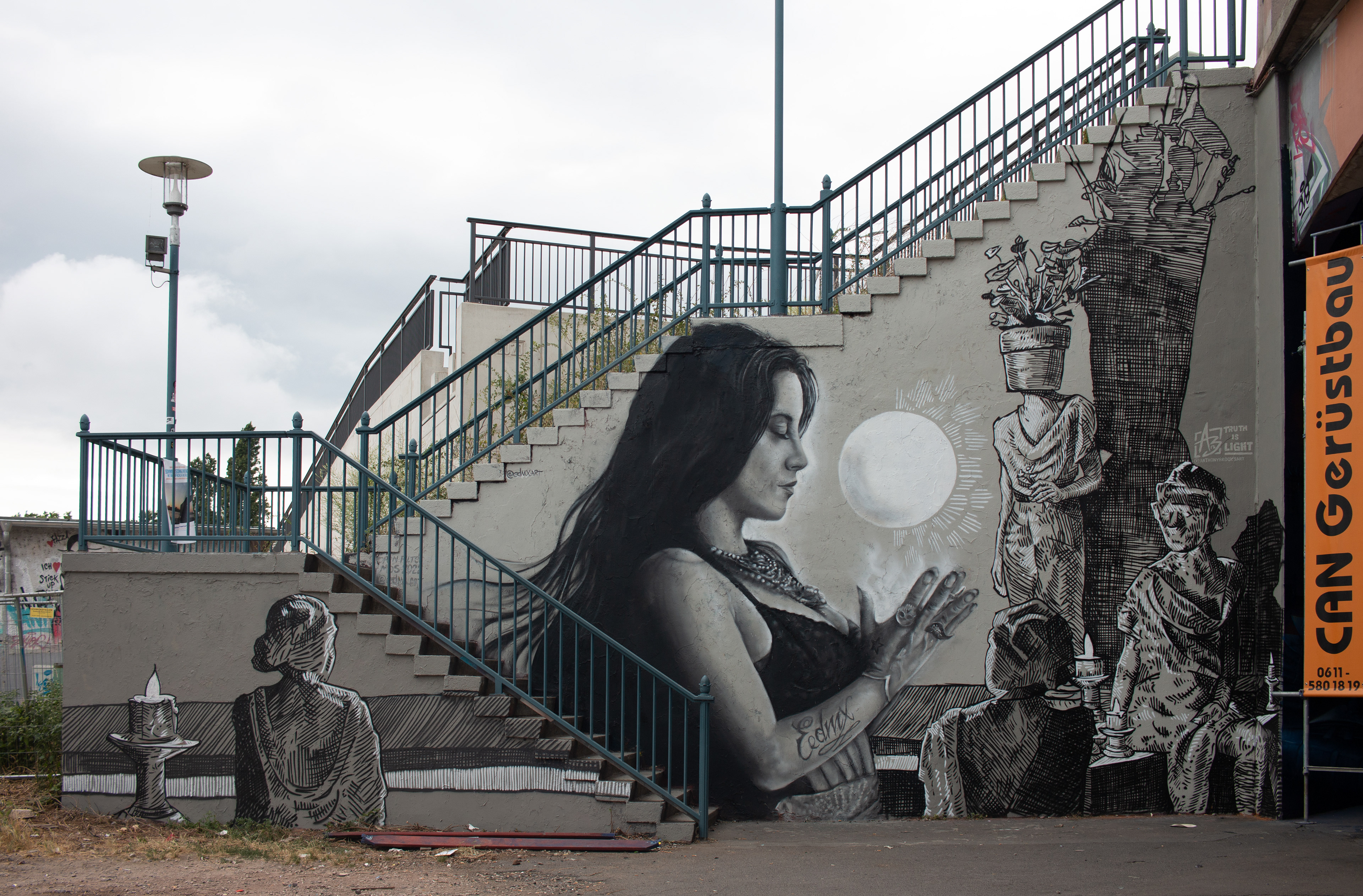 When I first showed up to paint at MOS Germany, I was planning on painting on a totally different wall with a few other people. The problem: prior to arrival, none of the other artists had responded to my questions in order to pre-plan and figure out what to paint. For an extra flip, the organizers of the festival gave me this giant wall to paint by myself over the next 2-3 days. As I was sitting and planning what I could do and sketching something out, artist EDMX from Brazil approached me and asked if he could paint something with me (despite neither of us knowing what the other paints/how our works could potentially mesh). After an hour of sketching together and thinking what we could do, this is what we came up with based on the festival theme of "Truth is Light".